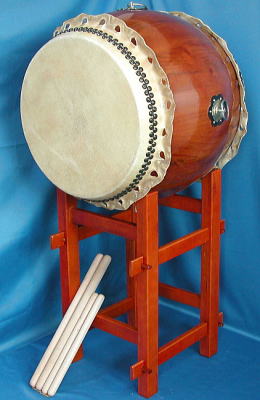 Form: The body is like a cylinder, usually made from wood, seldom metal or bamboo. On both sides a piece of leather from an oxen (gyuuhi 牛皮) is streached and kept in place with wide bolts or with a string for smaller drums (shimedaiko 締太鼓). The leather part is hit on one or both sides with a drumstick (bachi バチ). The body of the drum is usually placed on a wooden stand.